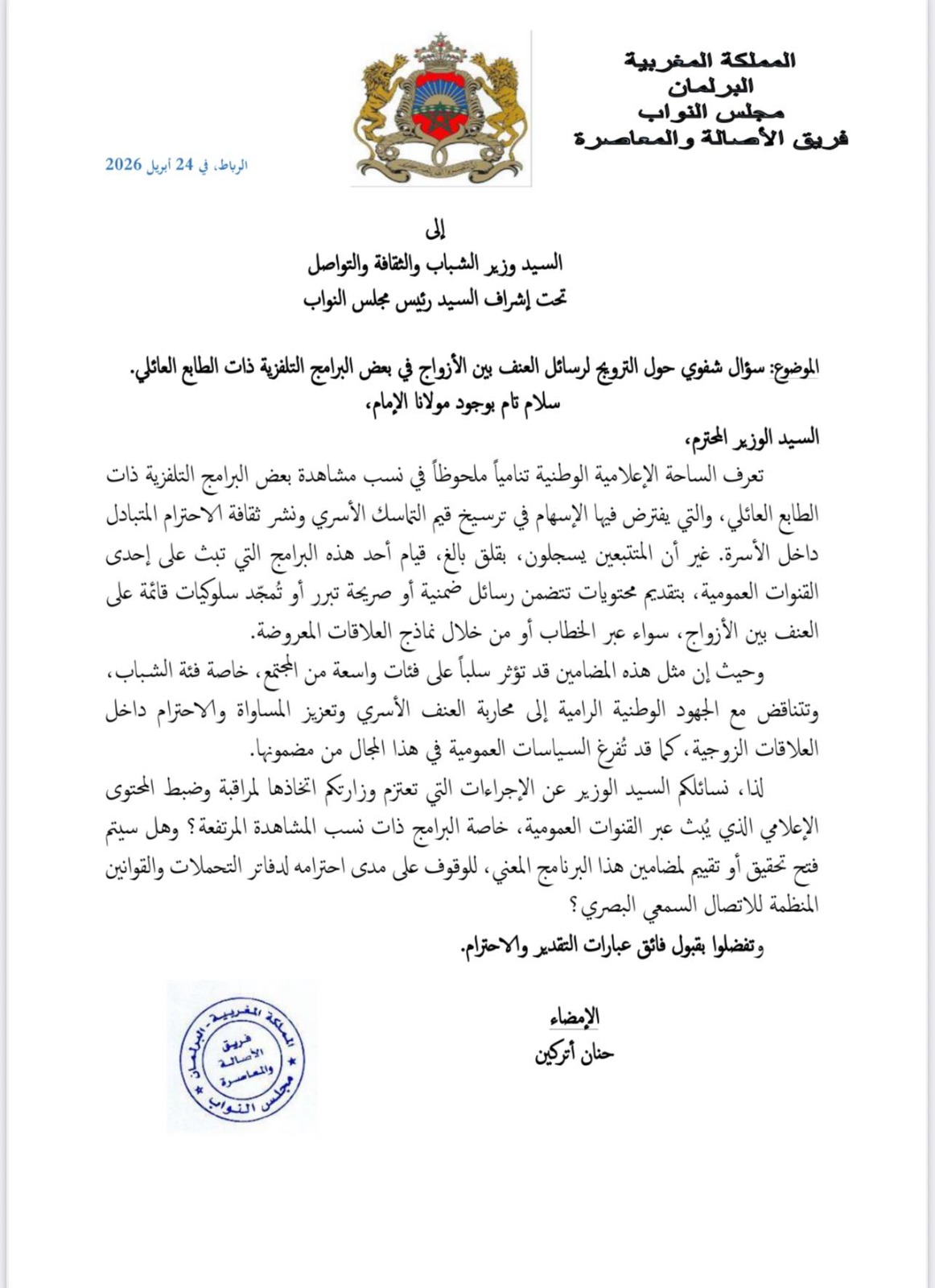 وجاء في المراسلة التي وقعتها النائبة البرلمانية حنان أتركين، أن الساحة الإعلامية الوطنية تسجل بقلق بالغ تقديم محتويات تتضمن رسائل ضمنية أو صريحة تبرر أو تمجد سلوكيات قائمة على العنف، وهو ما يتناقض تماماً مع القيم الأسرية والجهود الوطنية الرامية لمحاربة العنف المنزلي وتعزيز المساواة والاحترام داخل مؤسسة الزواج.