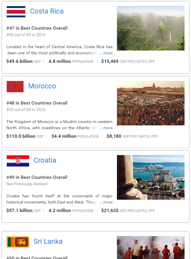 وقد صنّف الموقع السابق بلدان العالم عبر طرقٍ معقدة للحصول على أكثر الإجابات دقة، وقد قام بنشر البيانات على موقعه. وتمّ تصنيف البلدان ضمن عدد من التصنيفات الفرعية؛ أفضل البلدان للمغامرة والرحلات، أفضل البلدان من ناحية الأثر الثقافي، البلدان التي تتمتع بأعرق تاريخ، أكثر البلدان قوة، أفضل البلدان من حيث نوعية الحياة، أفضل البلدان للنساء، أفضل البلدان للأطفال، وأفضل البلدان التي يمكنك الاستثمار فيها.