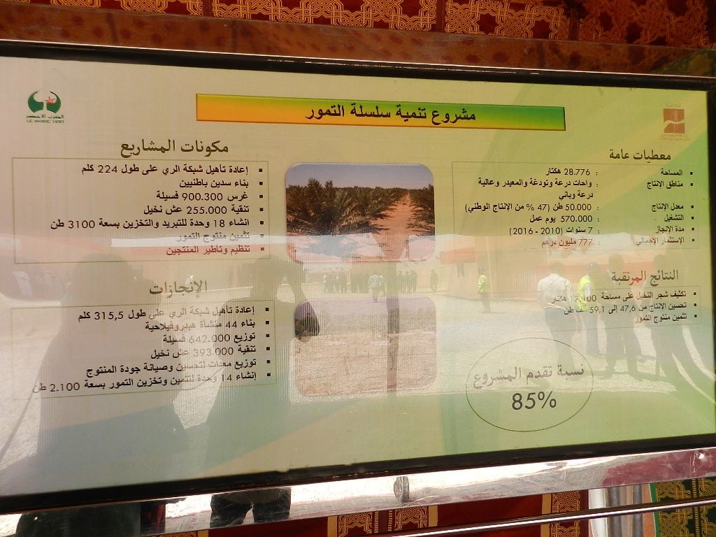 الزيارة الميدانية التي تستمر لغاية اليوم الثلاثاء 15/08/2017 شملت أمس الاثنين عددًا من المشاريع من بينها تتمة أشغال بناء وتجهيز وحدة توضيب وتخزين التمور بالجماعة الترابية لتودغى السفلى، حيث خصص لها المكتب الجهوي للاستثمار الجهوي بورزازات مبلغ مالي قدره خمسة ملايين وخمسة آلاف درهم، في البناء، ومليون درهم في التجهيزات، ومليون درهم في التجهيزات الخاصة بتوضيب التمور، فيما وصل المبلغ الإجمالي لوحدة تثمين التمور (الأشغال المنجزة والأشغال المرتقبة) حوالي 13 مليون درهم.