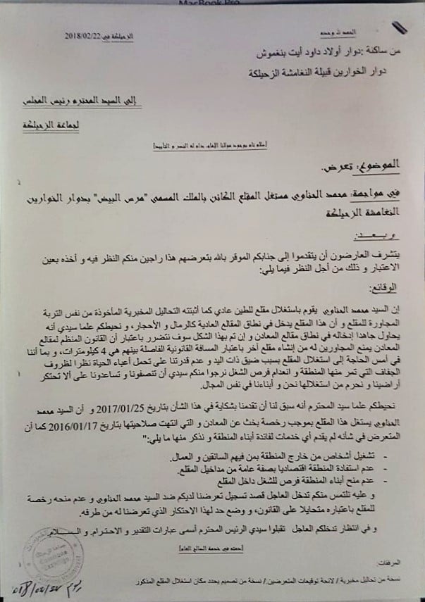 وحسب الوثائق التي توصل بها " أخبارنا "، فإن هذه الشركة التي تعود ملكيتها لموظف متقاعد بوزارة الرباح، حصلت على رخصة للتنقيب عن المعادن سنة 2009، تم تجديدها سنة 2012، لمدة أربع سنوات، انتهت سنة 2016، وفي مرحلة التجديد، تقريبا، أي في سنة 2014، حصلت الشركة على رخصة استغلال مؤقت، وذلك قبل صدور القانون المتعلق بالمناجم، لكن الشركة واصلت استغلال المقلع، رغم احتجاج سكان المنطقة، الذين طالبوا بوقف استغلال الشركة، مؤكدين أن الأخيرة تقوم باستخراج و بيع الطين و ليس " المعادن "، وهو ما اعتبروه خرقا للقانون، عقب ذلك ، وجه وزير التجهيز والنقل السابق، الاستقلالي بوعمر تغوان، الذي يشغل حاليا مهمة رئيس جماعة " زحيليكة "- وجه - بتاريخ 26 أبريل 2017، رسالة إلى وزير الطاقة والمعادن عزيز رباح، يطلب منه إيقاف استغلال مقلع وتعليق منح رخصة استغلاله، إلا أن الوزير رباح تجاهل المراسلة، التي تضمنت معطيات حول الخروقات التي تشوب عملية استغلال المقلع المتواجد لمنطقة الخوارين التابعة لجماعة " زحيليكة "، بناء على ترخيص بحث عن المعادن، صالح من تاريخ 16 يناير 2009 إلى غاية 16 يناير 2012، وجدد هذا الترخيص المتعلق دائما بالبحث عن المعادن من 26 يوليوز 2012، صالح من 17 يناير 2012 إلى غاية 17 يناير 2016.