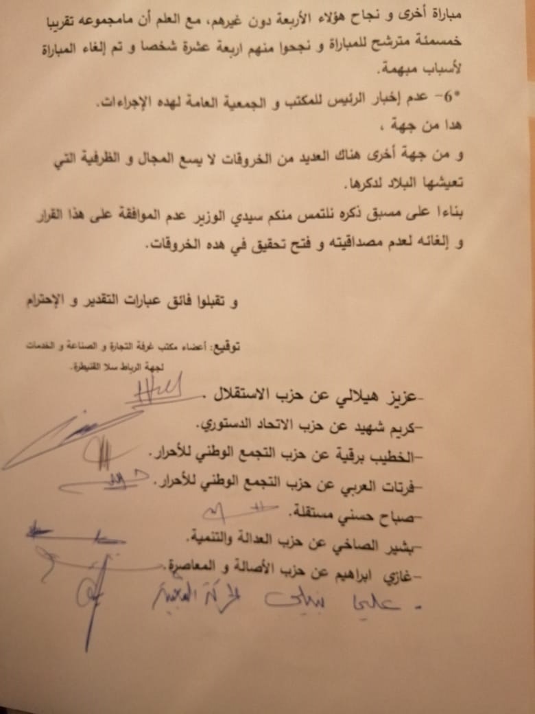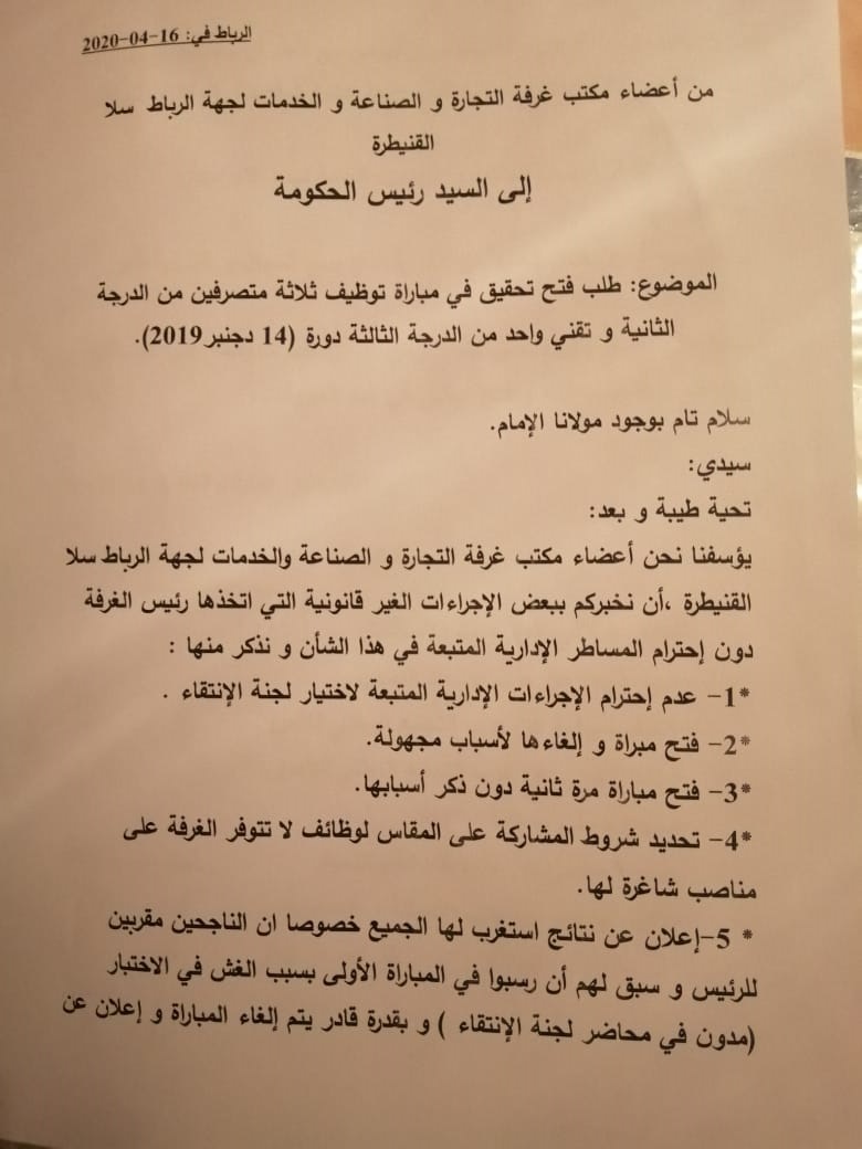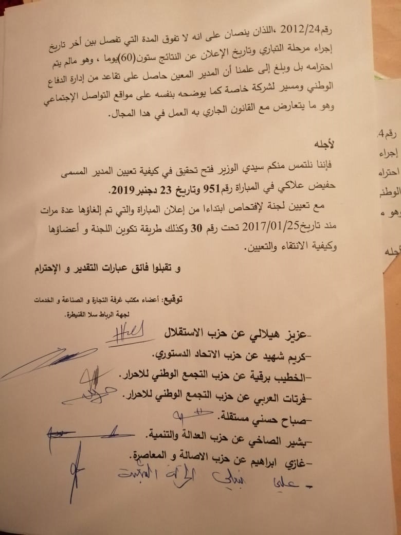 وقال الأعضاء في رسالتهم، إن رئيس غرفة التجارة والصناعة والخدمات بجهة الرباط\سلا\القنيطرة، لم يحترم الاجراءات الادارية المتبعة لاختيار لجنة الانتقاء.