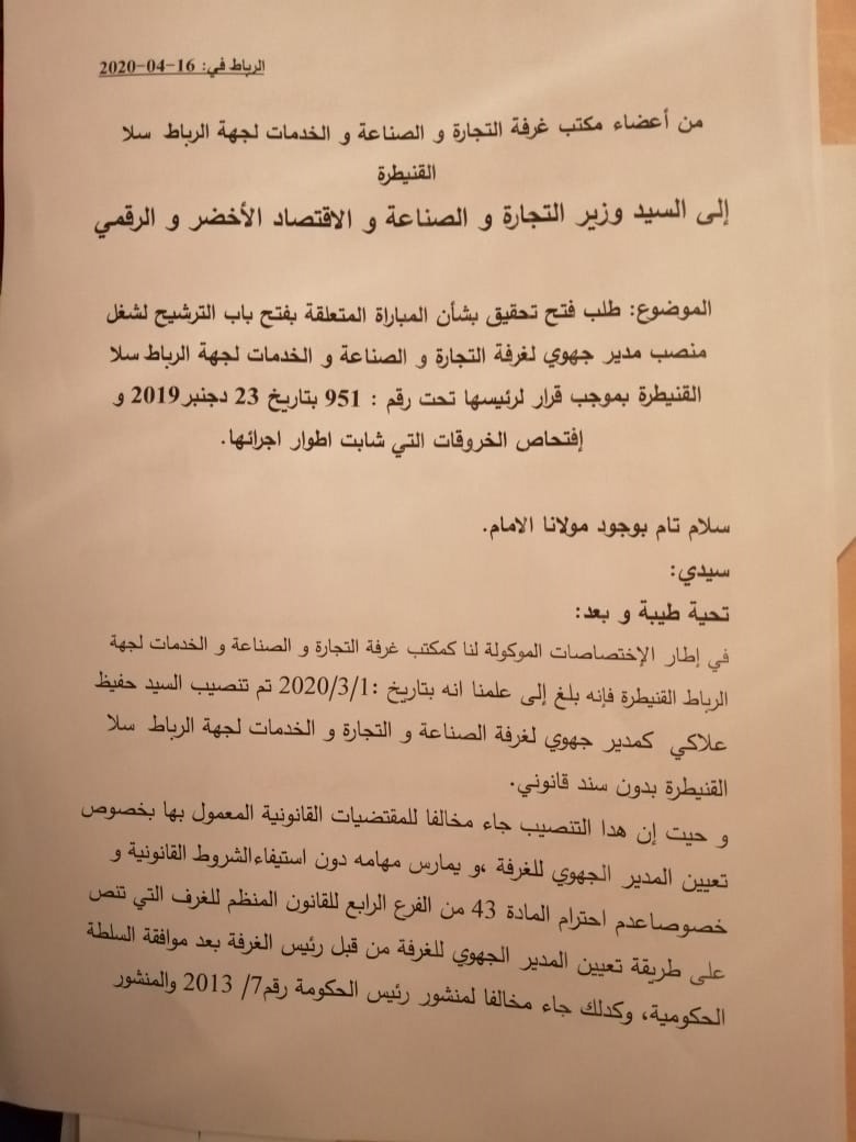 وفي رسالتهم الموجهة إلى وزير التجارة والصناعة، تحدث أعضاء مكتب الغرفة بشكل مباشر عن منصب المدير الجهوي للغرفة ح.ع الذي تم تنصيبه بدون سند قانوني، حسب ما جاء في نص الرسالة.