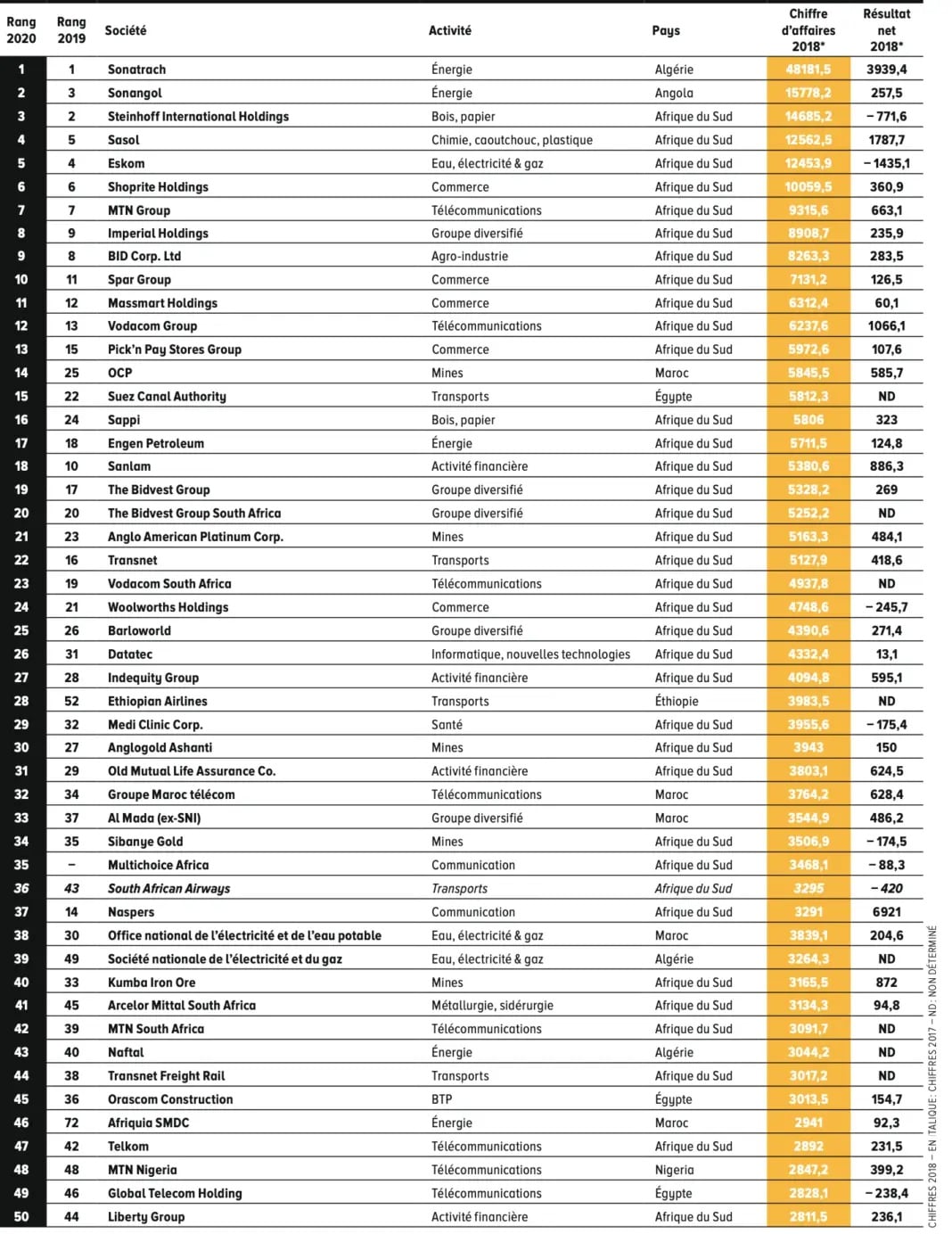 وكشفت مجلة جون أفريك الناطقة باللغة الفرنسية، عند تقديمها السنوي لترتيب أكبر 500 شركة افريقية لسنة، أن "جنوب افريقيا" تهيمن على القارة إلى حد كبير (51.8٪ من قيمة الشركات) ، في حين تسيطر الجزائر بنسبة 10،3% .