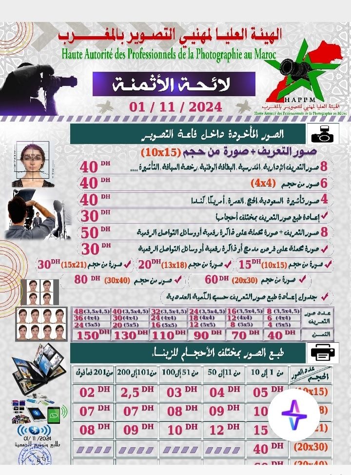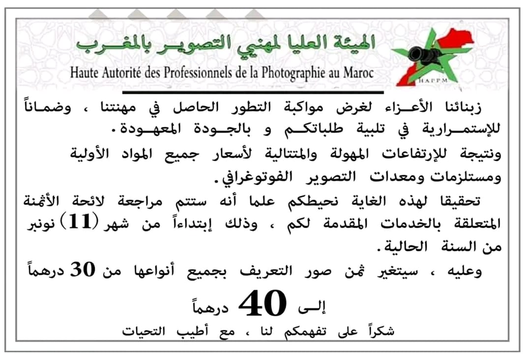 أعلنت الهيئة العليا لمهنيي التصوير بالمغرب عن قرارها زيادة أسعار خدمات التصوير الخاصة بصور التعريف المقدمة للمواطنين، وذلك في إطار مواكبة التطورات التي تشهدها المهنة وحرصاً على الاستمرار في تلبية الطلبات بالجودة المطلوبة.