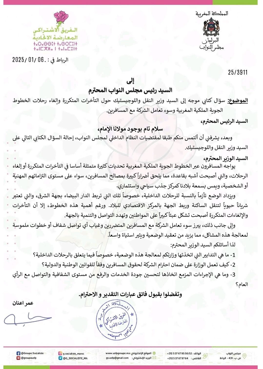 ولاحتواء هذه الأزمة التي طالبت، تساءل "أعنان" عن التدابير التي ستتخذها وزارة "قيوح" لمعالجة هذه الوضعية، لاسيما ما يتعلق بالرحلات الداخلية، لافتا الانتباه إلى دورها الضروري في ضمان احترام الشركة لحقوق المسافرين وفقاً للقوانين الوطنية والدولية، قبل أن يطالب بالكشف الإجراءات المزمع اتخاذها لتحسين جودة الخدمات والرفع من مستوى الشفافية والتواصل مع الرأي العام.
