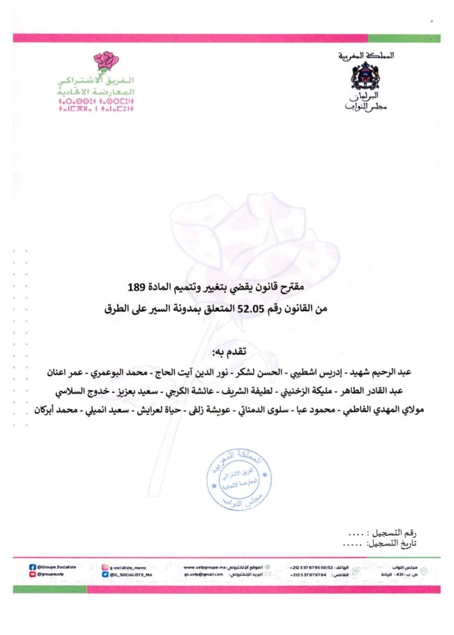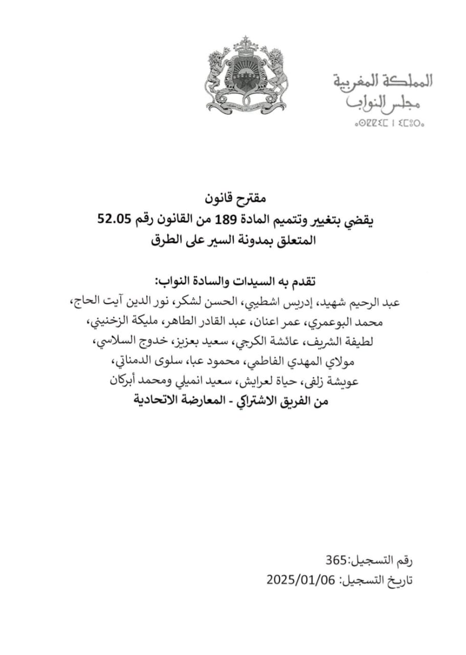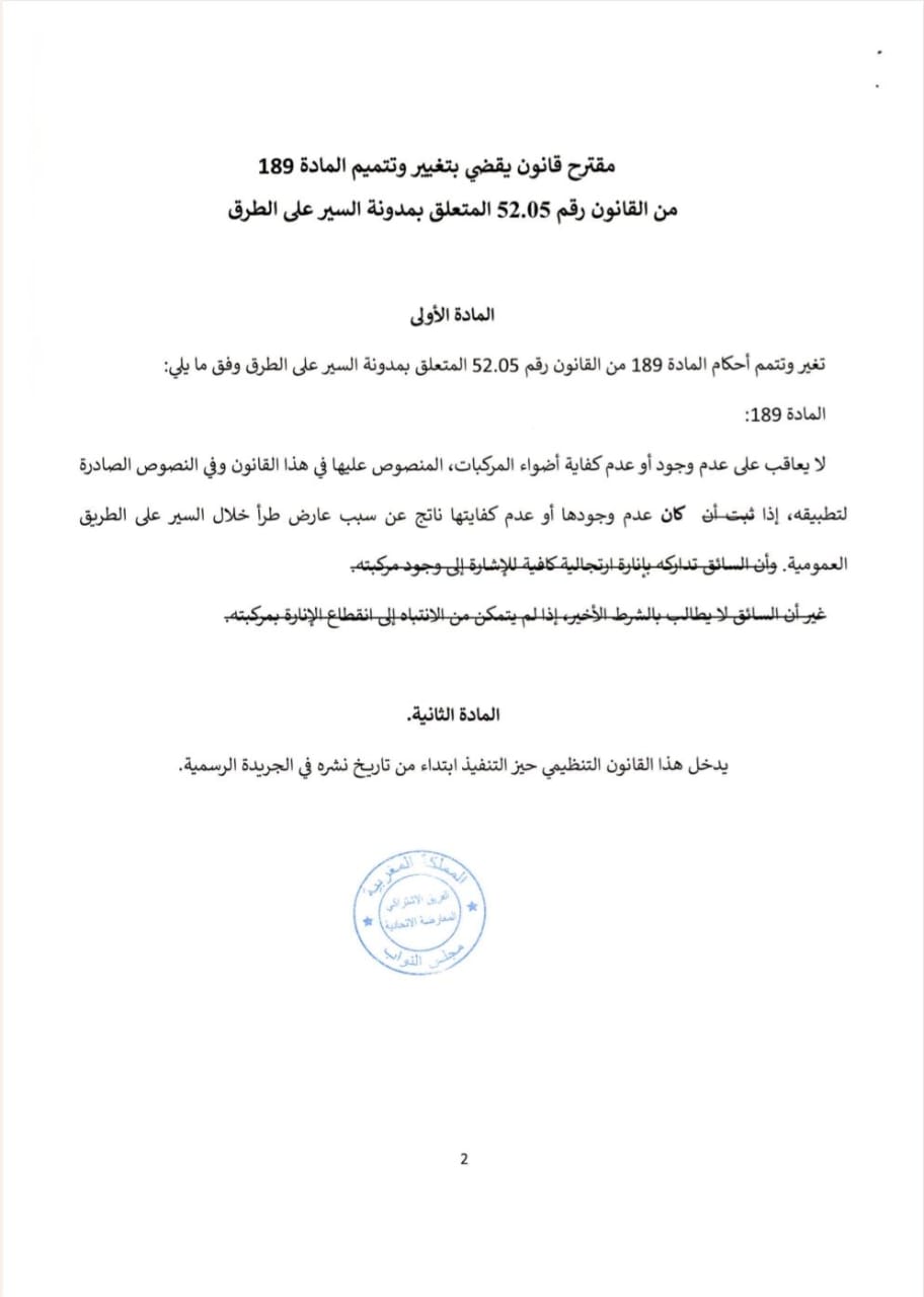 في خطوة تشريعية تهدف إلى وضع حد للجدل القائم حول مخالفات أضواء المركبات، تقدم الفريق الاشتراكي-المعارضة الاتحادية بمجلس النواب بمقترح قانون يقضي بتعديل المادة 189 من مدونة السير، وذلك استجابة للاحتجاجات المتكررة من طرف السائقين الذين يعتبرون أن تطبيق هذه المادة يكتنفه الكثير من الغموض، ويؤدي إلى تباين في الممارسات بين أعوان المراقبة الطرقية، مما يفتح الباب أمام التأويلات المتضاربة والشطط في استعمال السلطة.