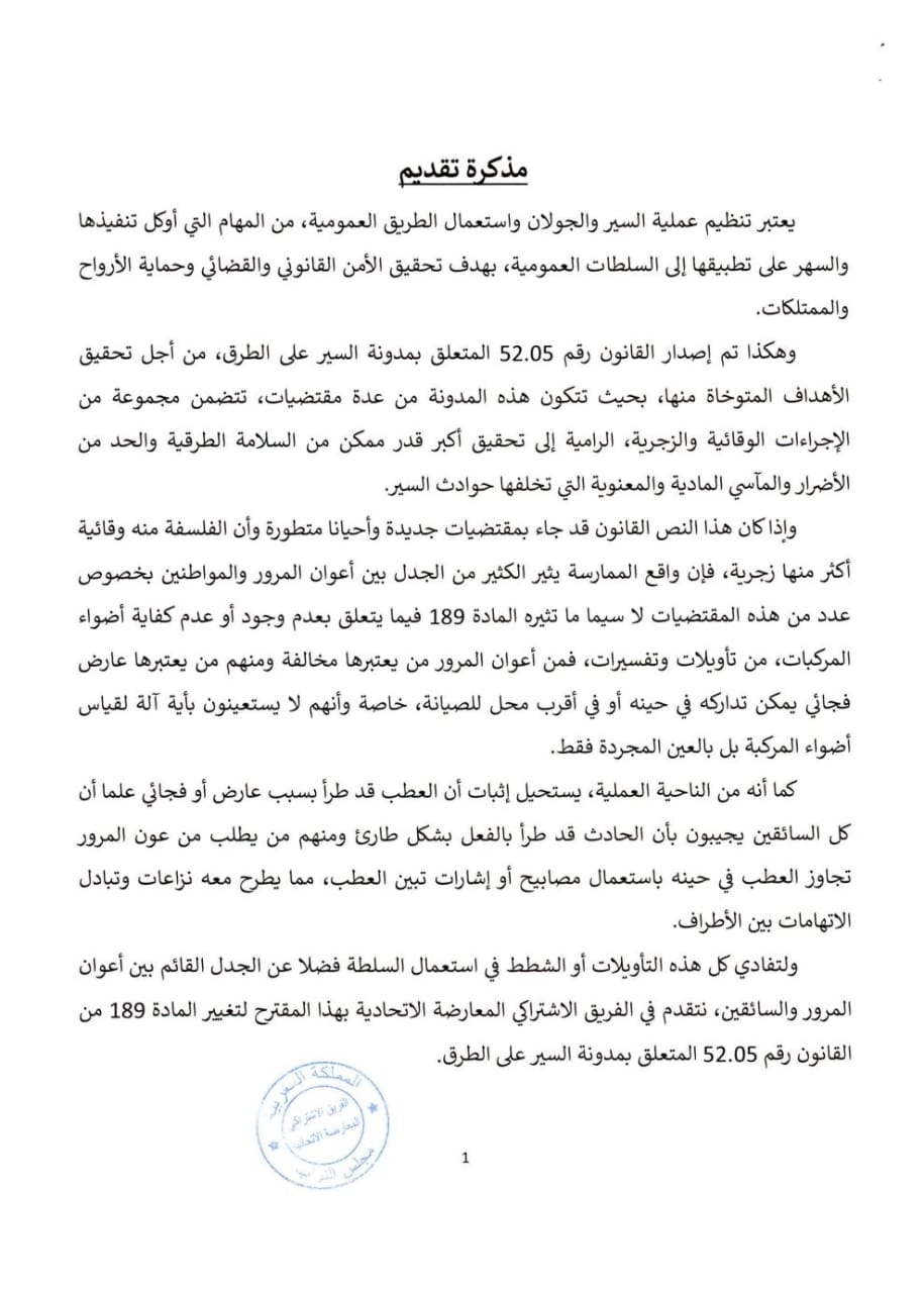 وقال الفريق إن مدونة السير، التي تم إقرارها بموجب القانون رقم 52.05، جاءت في الأصل لتأطير وضبط حركة المرور على الطرق العمومية، بهدف تعزيز السلامة الطرقية وتقليص نسبة حوادث السير التي تخلف خسائر مادية وبشرية جسيمة، حيث ورغم أن النصوص القانونية المنظمة لهذا المجال تتسم بطابع وقائي أكثر منه زجري، إلا أن بعض مقتضياتها، كما هو الحال بالنسبة للمادة 189، أثارت الكثير من الجدل بسبب صعوبة الحسم في مدى مسؤولية السائق عند تعرضه لعطب مفاجئ في أضواء مركبته أثناء السير.