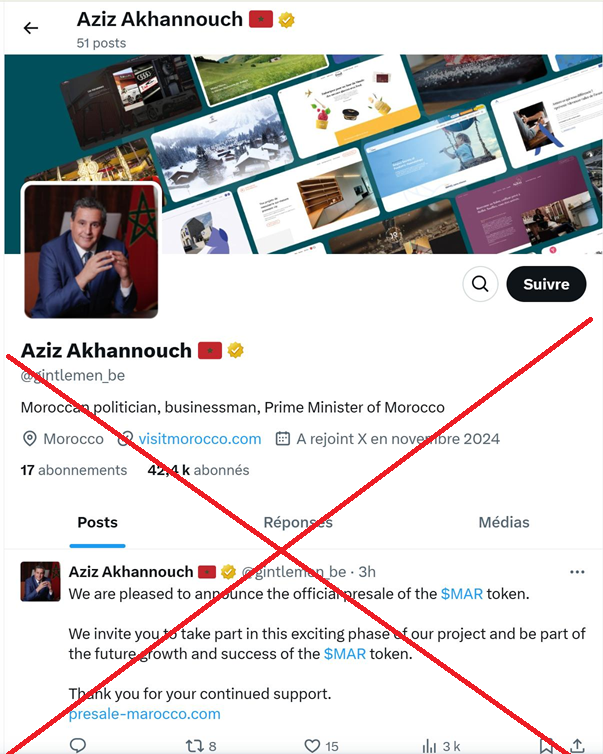 وأكد مصدر مقرب أن الحساب المذكور لا يمت بأي صلة لرئيس الحكومة، مشددًا على أن أخنوش لا يتوفر على أي حساب شخصي باسمه على منصة X، وأن الحساب الرسمي الوحيد الموجود على المنصة هو حساب « رئيس الحكومة المغربية" ولم يتعرض هذا الأخير لأي عملية اختراق.