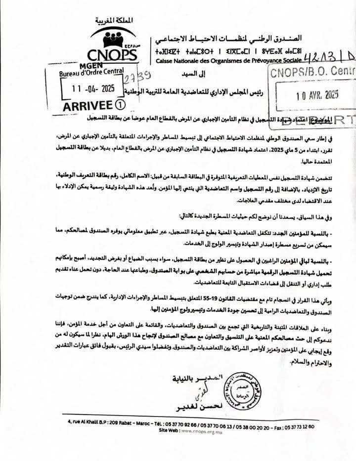وحسب مراسلة وجهها المدير بالنيابة للصندوق إلى رئيس المجلس الإداري للتعاضدية العامة للتربية الوطنية، فإن هذا الإجراء الجديد يأتي لتيسير مسطرة التسجيل وتمكين المرتفقين من الاستفادة من الخدمات دون انتظار صدور البطاقة أو تعويضها في حالة ضياعها، كما سيسمح باعتماد شهادة التسجيل المتاحة عبر تطبيق "Mon CNOPS" وبوابته الرقمية الرسمية، لتقديم ملفات المرض بشكل عادي.