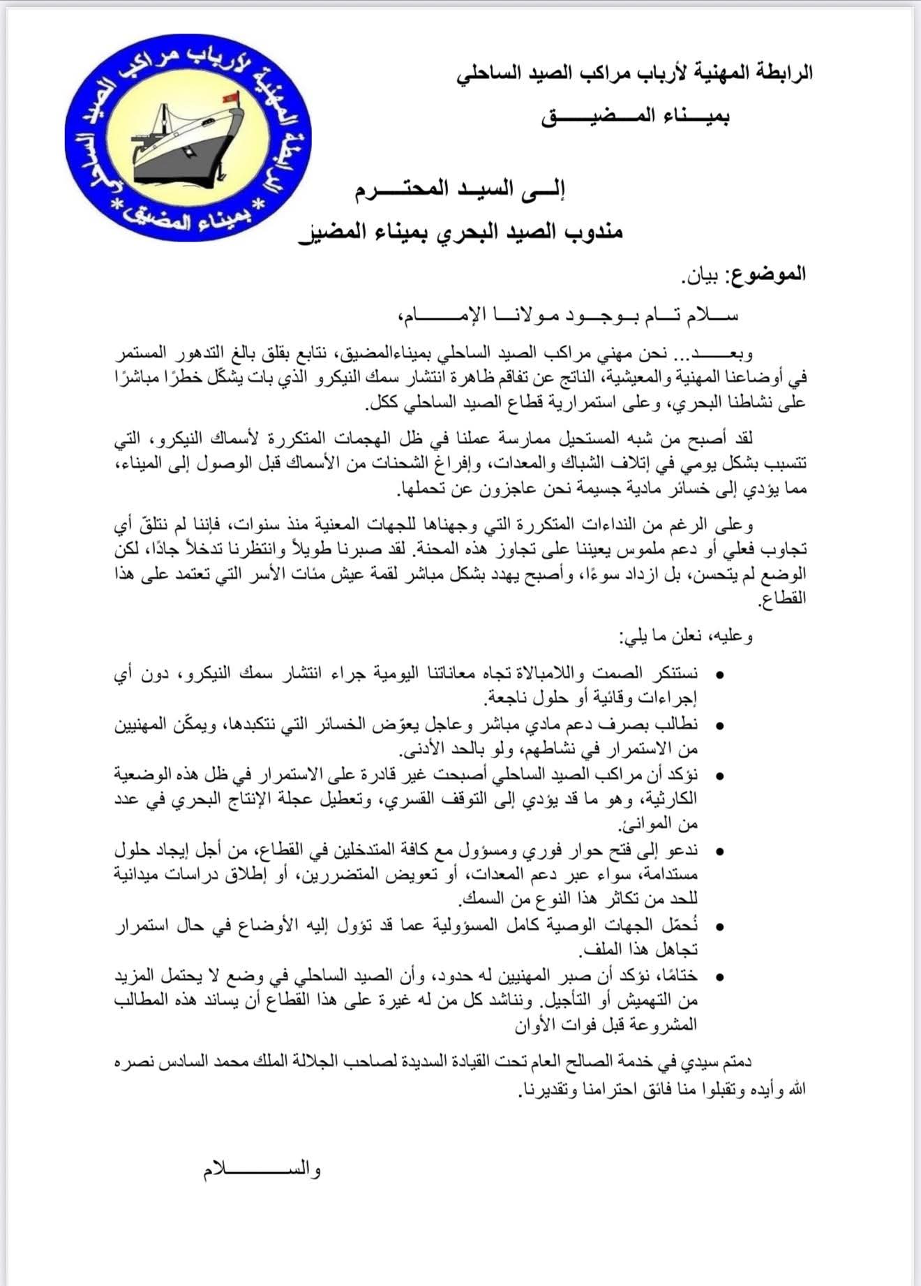 يتواصل الغضب في أوساط مهنيي الصيد الساحلي بالشمال، على خلفية الأضرار المتزايدة التي بات يتسبب فيها سمك "النيكرو"، المعروف بشراسته وسرعة انتشاره، والذي أصبح يشكل تهديدا مباشرا للسفن والمراكب، بل وللمنظومة الاقتصادية المرتبطة بهذا القطاع الحساس، حيث خرج أرباب مراكب الصيد الساحلي بميناء المضيق عن صمتهم، ووجهوا بيانا شديد اللهجة إلى مندوب الصيد البحري، عبروا فيه عن سخطهم الشديد من استمرار تجاهل نداءاتهم المتكررة، رغم توالي الخسائر الفادحة التي يتكبدونها يوميا.