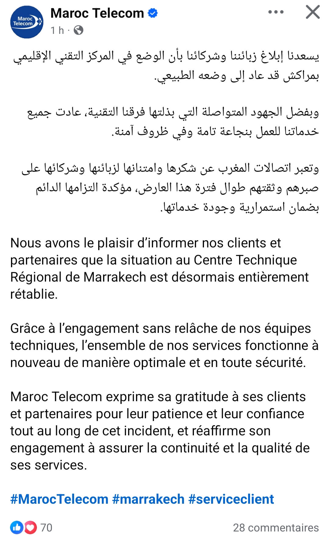 أعلنت شركة اتصالات المغرب عن عودة جميع خدماتها للعمل بشكل طبيعي وآمن في المركز التقني الإقليمي بمراكش، وذلك بعد انقطاع مؤقت، على خلفية حريق بالمركز التقني الإقليمي.