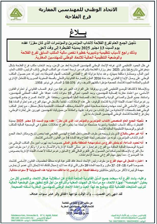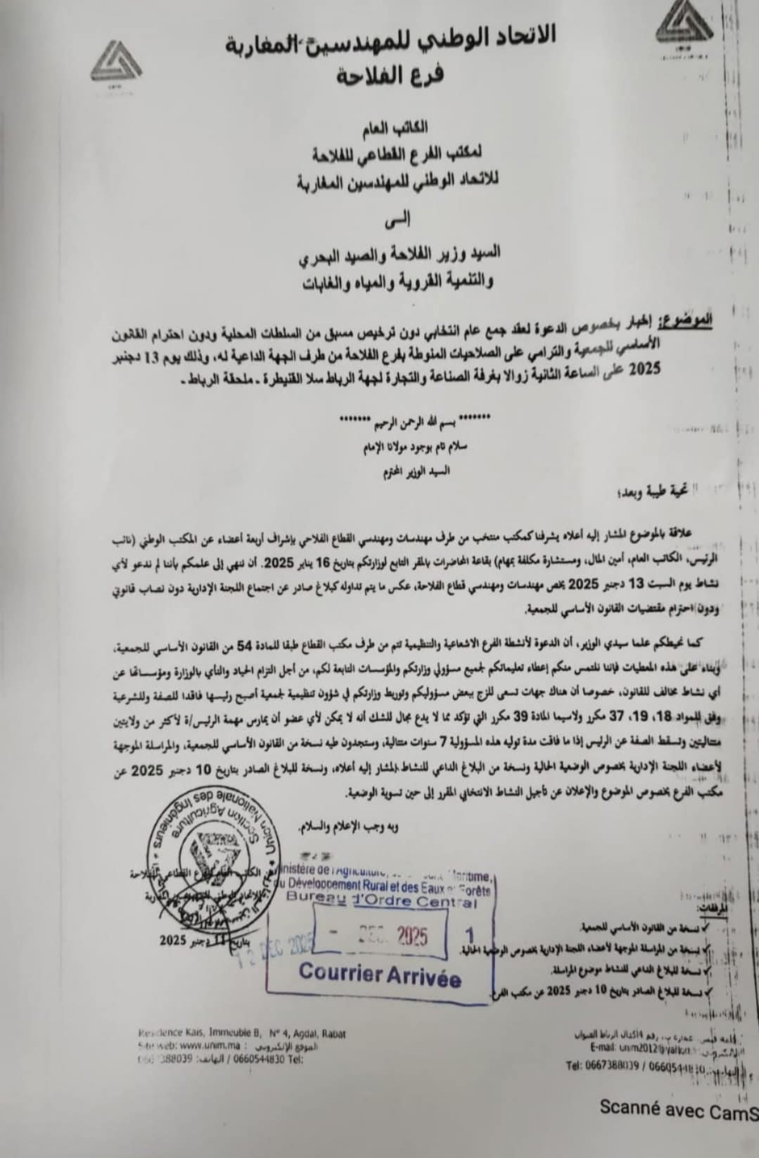 وجه المكتب الوطني لفرع الفلاحة التابع للاتحاد الوطني للمهندسين المغاربة مراسلة رسمية إلى وزير الفلاحة والصيد البحري والتنمية القروية والمياه والغابات، حذر فيها من عقد جمع عام استثنائي، وصفه بـ"غير القانوني"، بسبب تنظيمه دون ترخيص مسبق من السلطات المختصة، وخارج المقتضيات التنظيمية المؤطرة لعمل الاتحاد.