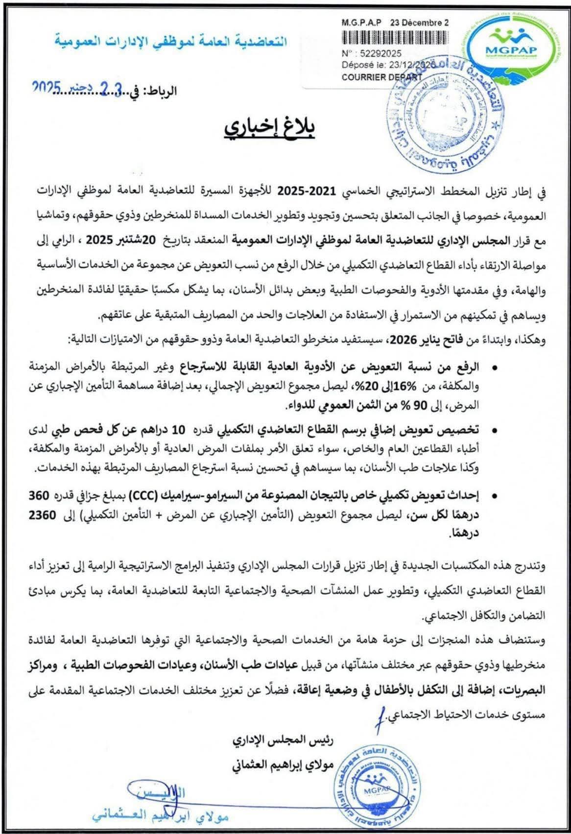 في خطوة جديدة تروم تعزيز الحماية الصحية والاجتماعية لفائدة منخرطيها، أعلنت التعاضدية العامة لموظفي الإدارات العمومية عن حزمة من الإجراءات الجديدة تهم الرفع من نسب التعويض عن عدد من الخدمات الصحية الأساسية، وعلى رأسها الأدوية والفحوصات الطبية وبعض علاجات طب الأسنان، وذلك في إطار تنزيل المخطط الاستراتيجي الخماسي 2021-2025، وتنفيذا لقرارات مجلسها الإداري المنعقد بتاريخ 20 شتنبر 2025.