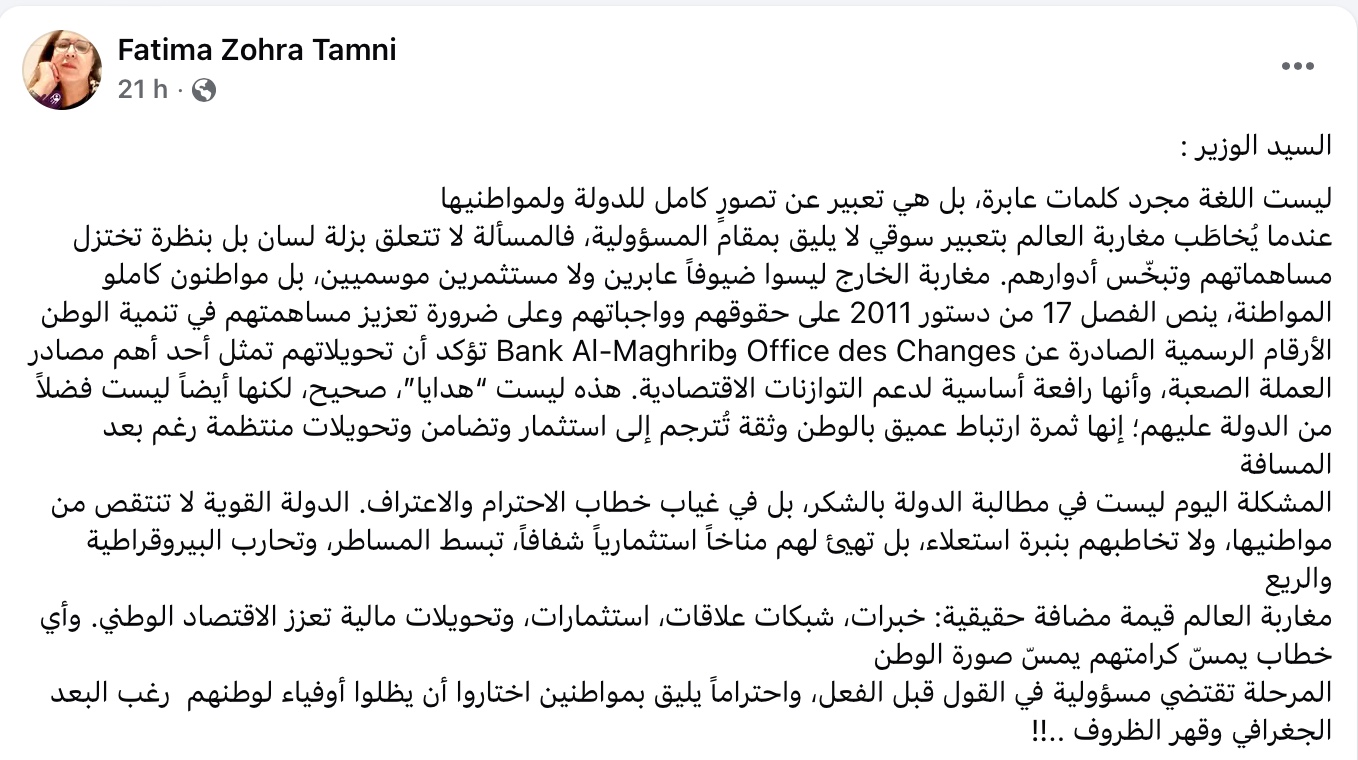 وجاء تدخل "التامني" من خلال تدوينة نشرتها عبر حسابها الفيسبوكي، اعتبرها كثير من المتابعين تفاعلاً مع موجة الغضب التي عبرت عنها فئات واسعة من مغاربة العالم، والتي اعتبرت أن تصريحات الوزير كانت مسيئة ومقللة من حجم إسهاماتهم الاقتصادية والوطنية لأفراد الجالية.