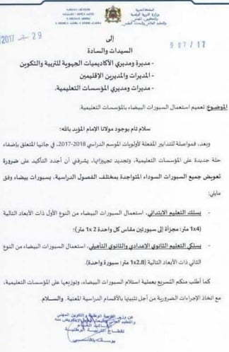 كما سبق وأن أشرنا إلى ذلك مطلع هذا الشهر، أصدر وزير التربية الوطنية ، محمد حصاد، اليوم مذكرة وزارية وجهها إلى مديري الأكاديميات والمديريات والمؤسسات التعليمية يطالبهم فيها بضرورة تسريع عملية استلام وتوزيع وتثبيت السبورات الجديدة البيضاء داخل جميع الحجرات الدراسية.