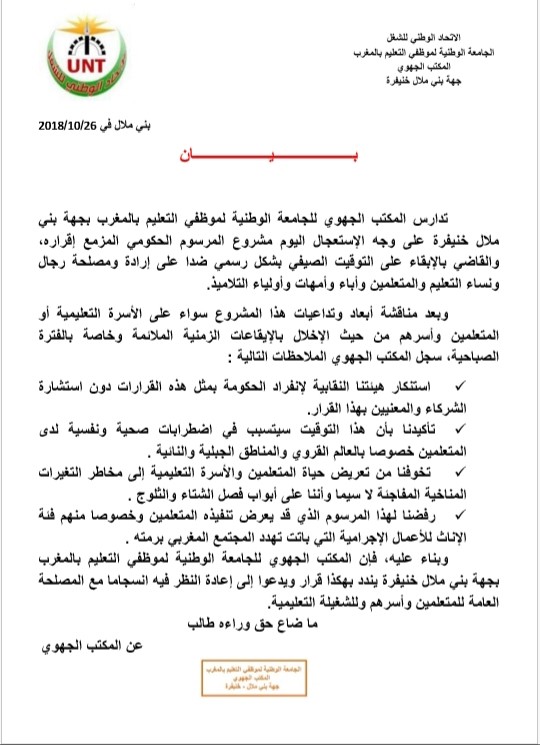يبدو أن القرار اللاشعبي للحكومة المغربية للابقاء على التوقيت الصيفي طيلة السنة لن يمر مرار الكرام على الشعب المغربي ، فاليوم خرجت النقابة التعليمية للاتحاد الوطني للشغل بجهة بني ملال خنيفرة ببيان ناري أطلقت فيه مدفعيتها الثقيلة على الحكومة واستنكرت استفرادها باتخاد مثل هاته القرارات دون اشراك باقي الشركاء.