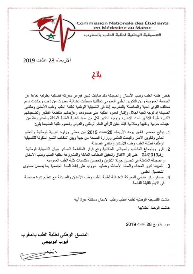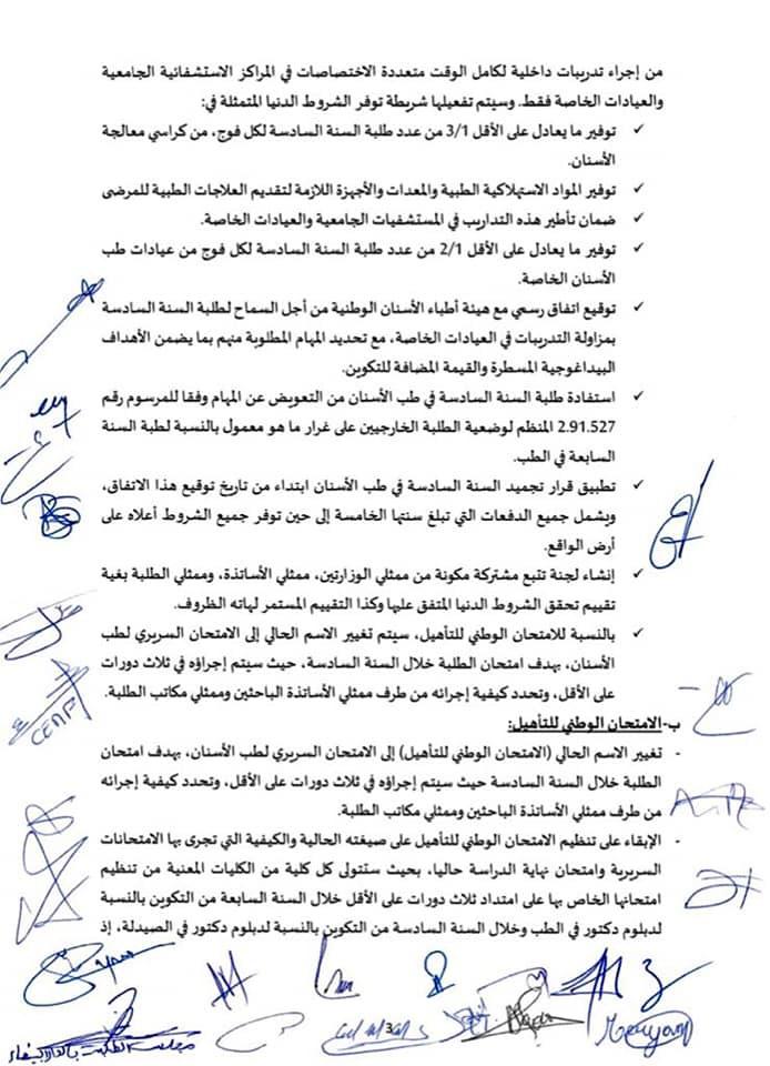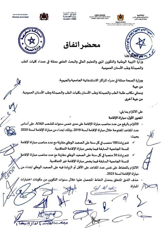 ممثلو "الطلبة الأطباء" توصلوا إلى اتفاق مع وزارة التعليم العالي، ليتقرر رسميا توقيع محضر استئناف الدراسة ووقف الإضراب المفتوح، أمس الأربعاء، مباشرة بعد جلسة تصويت تمت الاثنين الماضي بفرق بسيط بين (نعم) و(لا) حددته مصادر أخبارنا في حوالي 4 بالمائة من الأصوات، قبل أن تقرر قيادات الطلبة الخنوع للسلم والعودة لمقاعد الدراسة مؤكدة أن الوزارة وافقت على 25 نقطة طرحها طلبة الطب في وقت سابق؛ ومن ضمنها الزيادة في المنحة المخصصة لطلبة السنة السابعة، منع طلبة المؤسسات الخصوصية والشريكة من اجتياز المباريات الداخلية، مع السماح لهم باجتياز مباريات الإقامة لكن مع رفع عدد المناصب ب_ 150 مقعدا هذه السنة، و450 مقعدا خلال السنوات المقبلة...