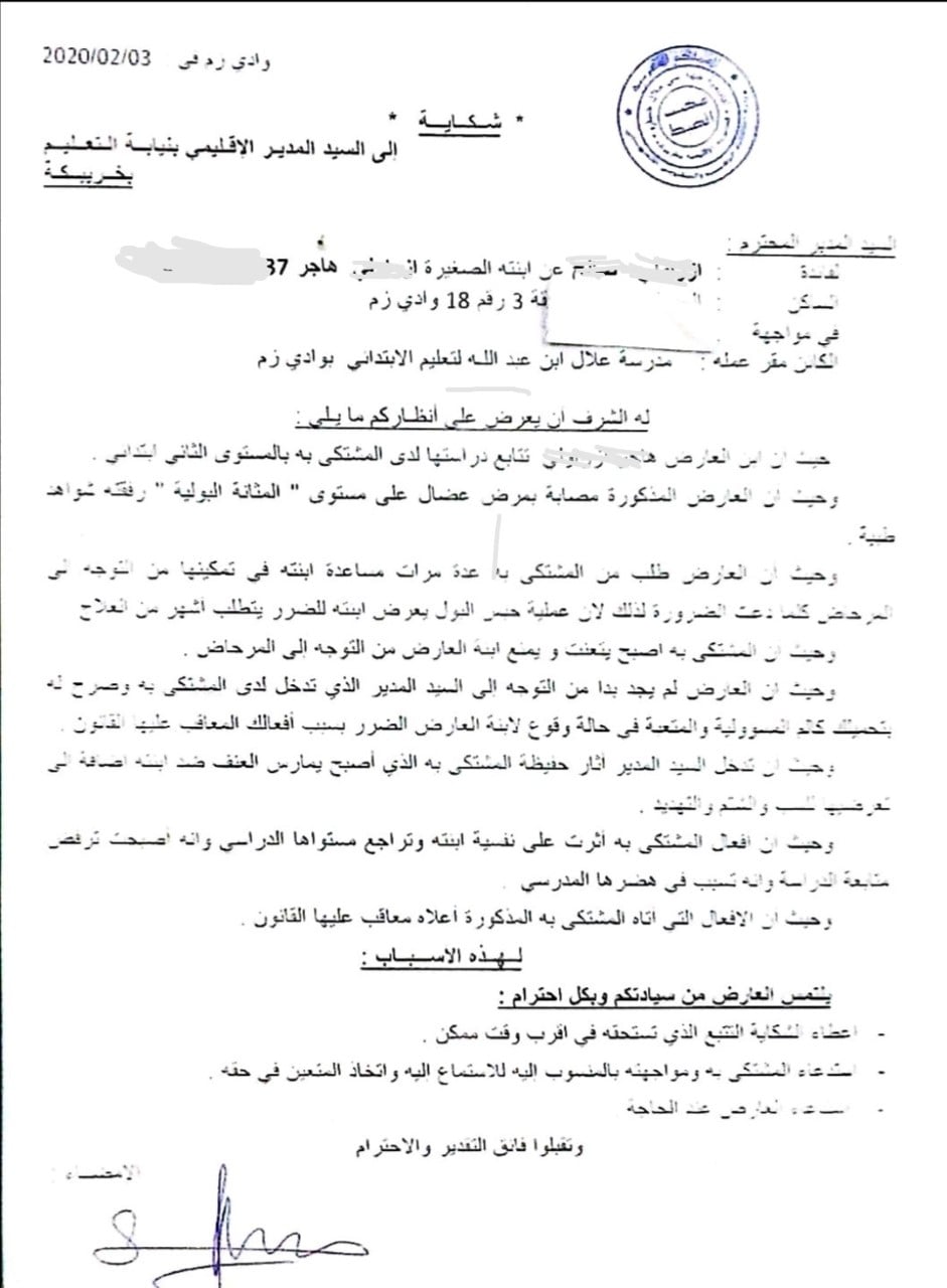 وجه أب تلميذة تتابع دراستها بالمستوى الثاني بمدرسة ابتدائية بواد زم التابعة لمديرية التعليم بخريبكة، شكاية للمدير الإقليمي يتهم فيها أستاذها "بالتعنت ومنعها من الذهاب للمرحاض"، رغم أن توجه إليه مرات عديدة بطلبات لتمكين ابنته المصابة بمرض "عضال" من الذهاب للمرحاض كلما دعت الضرورة لذلك، وعلما أن عملية "حبس" البول تتسبب لها في أضرار في مثانتها تستدعي شهورا من العلاج تقول الشكاية التي توصلت أخبارنا بنسخة منها.