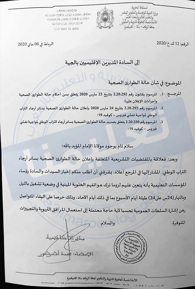 وجَّه محمد أضرضور مدير الأكاديمية الجهوية لجهة الرباط ــ سلا ـ القنيطرة، مراسلة إلى مديري المؤسسات التعليمية المتواجدة بالجهة، يطلب منهم ترك هواتفهم مشغلة على مدار الساعة وكذا أيام الأحد.