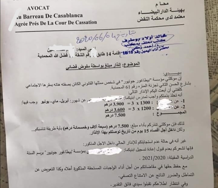 أولياء أمور عمدوا لنشر نسخ من الإنذارات، التي توصلوا بها على يد منتدبين قضائيين، طُلب منهم فيها أداء ما بذمتهم من مبالغ مستحقة إلى مؤسسات التعليم، في أجال محددة في 15 يوما، تحت طائلة طرد أبنائهم، أو عدم تسجيلهم في الموسم المقبل 2020-2021، مع العمل على مقاضاتهم، والمطالبة بالإضافة إلى الأداء الشهري، التعويض عن التماطل والضرر الناتج عما سُمي الامتناع التعسفي.
