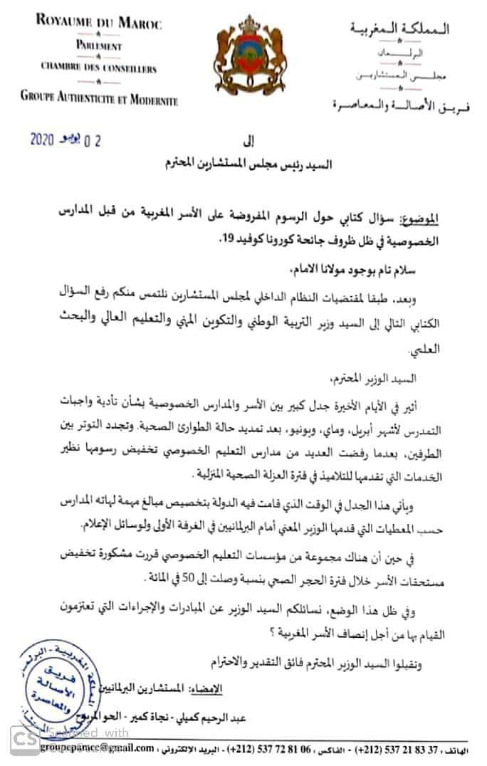 وجه ثلاثة مستشارين من فريق الأصالة والمعاصرة بمجلس المستشارين سؤالا كتابيا لوزير التربية الوطنية والتكوين المهني والتعليم العالي والبحث العلمي حول الرسوم المفروضة على الأسر المغربية من قبل المدارس الخصوصية في ظل جائحة كورونا كوفيد 19.