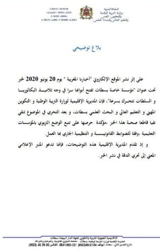 سارعت وزارة التربية الوطنية والتكوين المهني والتعليم العالي والبحث العلمي إلى نشر بلاغ توضيحي ترد من خلاله على الخبر المنشور على صفحات موقعنا والذي تحدث عن قيام مؤسسة تعليمية خاصة بسطات بفتح أبوابها سرا من أجل تقديم دروس الدعم والتقوية لفائدة التلاميذ المقبلين على اجتياز امتحانات الباكلوريا.