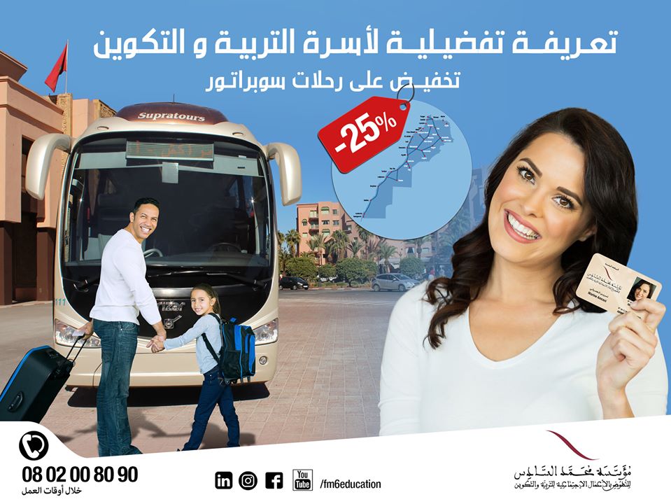 وقعت مؤسسة محمد السادس للتعليم، اليوم، اتفاقية شراكة مع شركة النقل "سوبراتور" تخول التخفيض على التنقل على متن حافلاتها، لفائدة كل المنخرطين، مزاولين أو متقاعدين، وأزواجهم وأبنائهم، المتراوحة أعمارهم ما بين 4 و21 سنة، وذلك في إطار التخفيف من تكاليف التنقلات أو السفر لفائدة أسرة التربية التكوين.