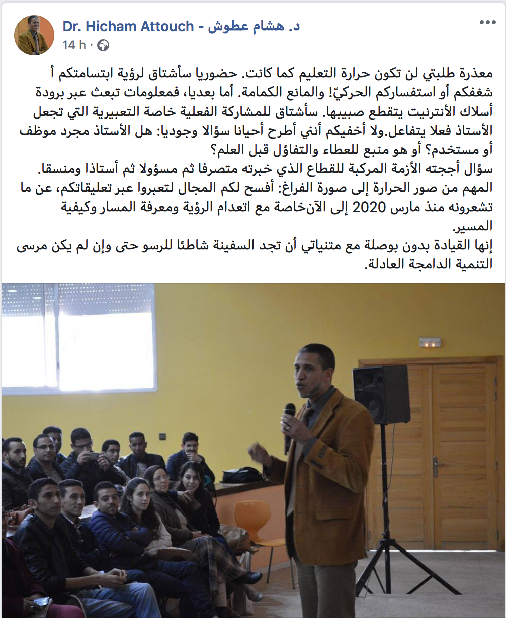 في سياق الأوضاع التي تمر منها البلاد بفعل انتشار فيروس كورونا، الذي فرض التخلي عن نظام "التعليم الحضوري" بالجامعات المغربية حتى إشعار آخر، اختار الدكتور "هشام عطوش"، أستاذ الاقتصاد بجامعة محمد الخامس بالرباط -اختار- أن ينشر تدوينة مؤثرة جدا عبر صفحته الفيسبوكية الخاصة، حازت تفاعلا كبيرا، بفعل ما حملته من رسائل قوية.
