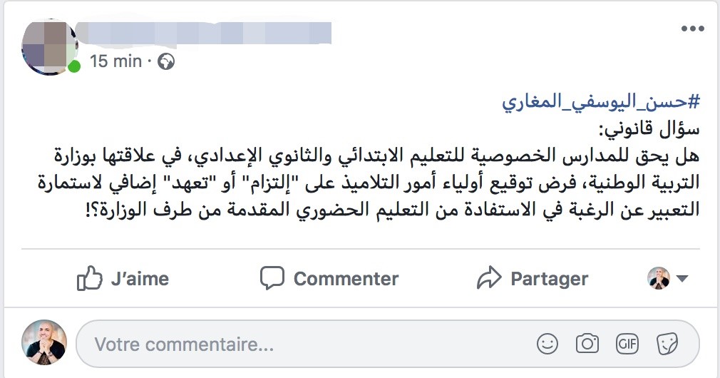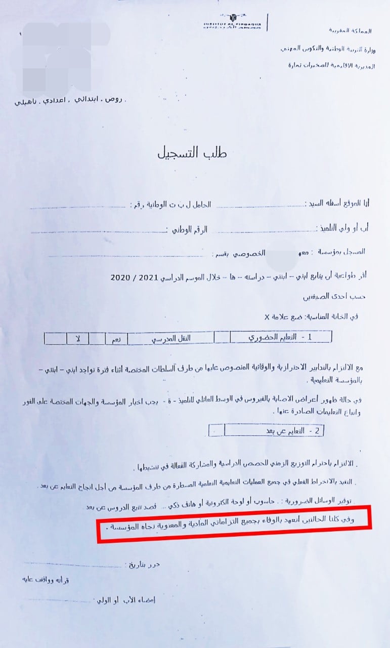 بعد أن أكدت وزارة التعليم في بلاغ سابق لها، أن الأباء وأولياء أمور التلاميذ ملزمين بملأ استمارة يحددون من خلالها نمط الدراسة الذي يرغبون فيه (إما حضوري أو عن بعد)، ووضعت لأجل ذلك وسائط لوضع هذه الاستمارة (إما عبر موقع مسار أو المؤسسة التي يدرس بها أبنائهم)، كانت صدمة أباء وأولياء تلاميذ يدرسون بمؤسسة خاصة بالصخيرات -صدمة- كبيرة جدا، بعد أن فرضت عليهم إدارة المؤسسة المذكورة توقيع "إلتزام" آخر، كشرط أساسي من أجل تسجيل أبنائهم.