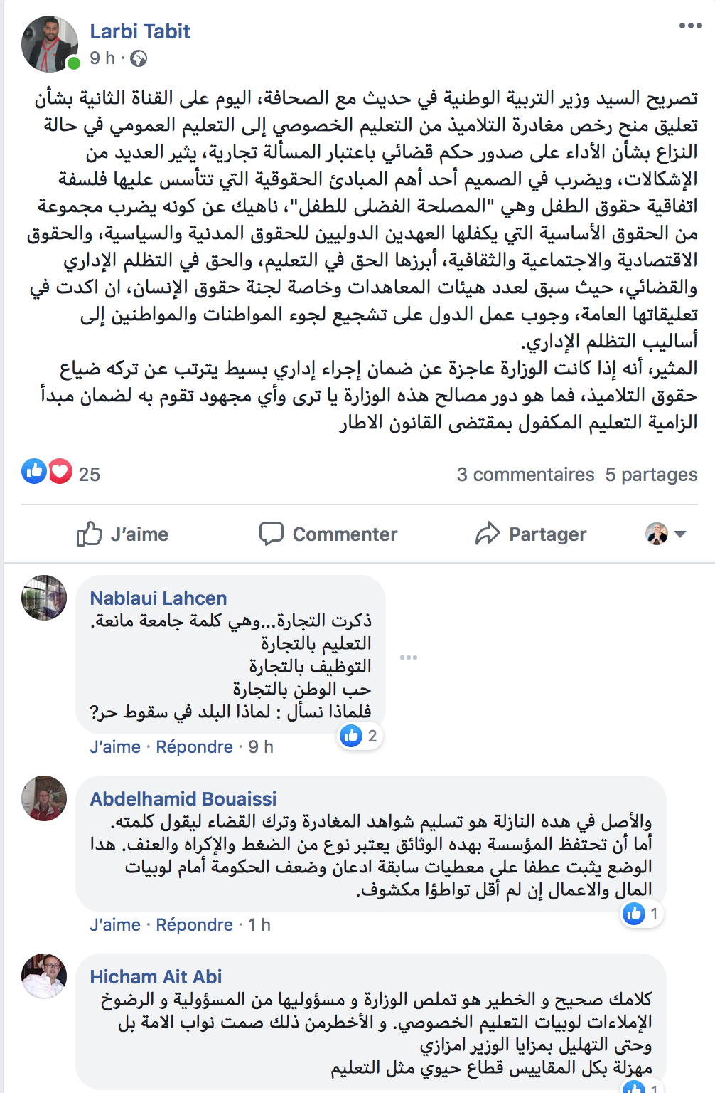 المثير في الأمر بحسب التدوينة التي نشرها الأستاذ "ثابت" عبر حسابه الفيسبوكي أنه: "إذا كانت الوزارة عاجزة عن ضمان إجراء إداري بسيط يترتب عن تركه ضياع حقوق التلاميذ، فما هو دور مصالح هذه الوزارة يا ترى وأي مجهود تقوم به لضمان مبدأ الزامية التعليم المكفول بمقتضى القانون الاطار".