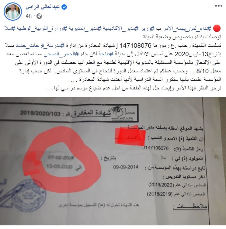 وقال الفاعل الجمعوي في تدوينة له على صفحته بالفايسبوك : "تسلمت التلميذة رحاب .ع رموزها 147108076 ج شهادة المغادرة من إدارة مدرسة فرحات حشاد بسلا بتاريخ 13مارس2020 على أساس الانتقال إلى مدينة طنجة لكن جاء الحجر الصحي مما استعصى معه على الالتحاق بالمؤسسة المستقبلة بالمديرية الإقليمية لطنجة مع العلم أنها حصلت في الدورة الأولى على معدل 8/10 ... وحسب عملكم تم اعتماد معدل الدورة للنجاح في المستوى السادس...لكن حسب إدارة المؤسسة علمت بأنها ستكرر السنة الدراسية لأنها أخذت شهادة المغادرة . ."