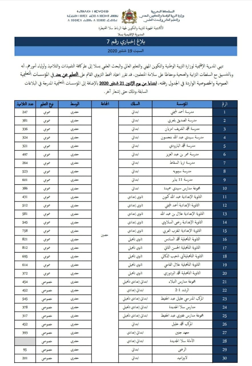 أعلنت المديرية الإقليمية لوزارة التربية الوطنية بسلا، أنه إبتداء من يوم الإثنين 21 شتنبر 2020، سيتم اعتماد التعليم عن بعد 30 مؤسسة تعليمية.