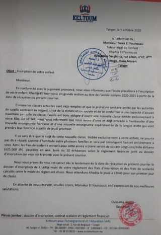 إدارة المؤسسة بررت هذا المبلغ الخيالي بكون جميع الأقسام ممتلئة ولا يمكنها إضافة التلميذة هناك نظرا لشروط التباعد الصحي التي فرضتها الوزارة، وبالتالي فإنها ستنشئ فصلا دراسيا جديدا خاصا بها لوحدها وستعمل على توظيف أستاذتين، على ان يتحمل ولي الأمر جميع التكاليف بمفرده.