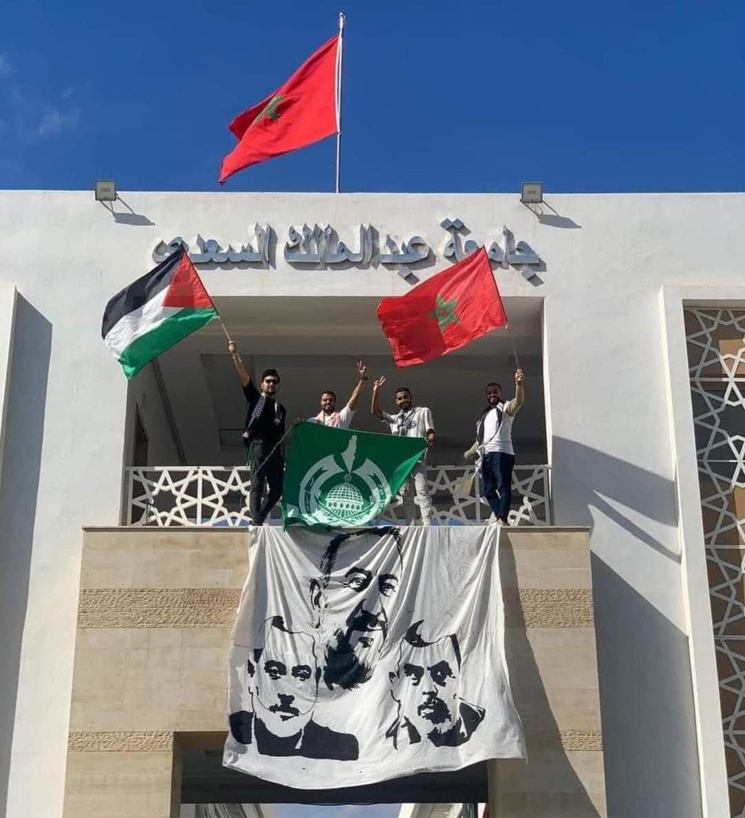 وتظهر الصور أربع طلبة فوق الباب الرئيسي للكلية يحملون العلم المغربي والفلسطيني وشعار حركة المقاومة الإسلامية حماس، بعد تعليقهم لقماش أبيض كبير رسمت عليه صور قادة حماس، صالح العاروري، يحيى السنوار وإسماعيل هنية، بينما تظهر خلفهم صورة الناطق باسم كتائب القسام" أبو عبيدة".