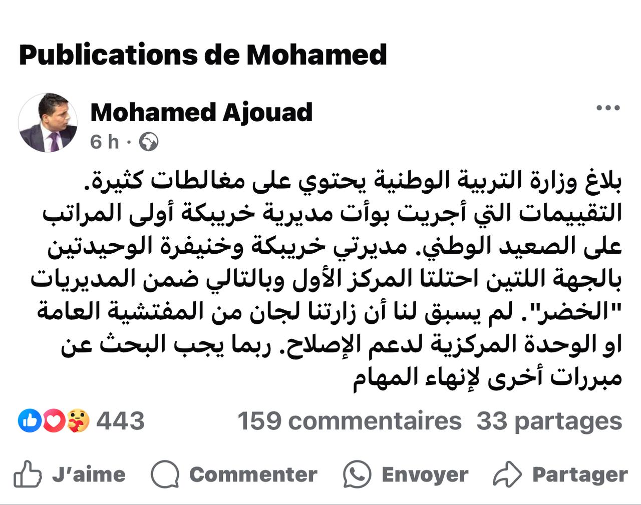 لم يتأخر الرد كثيرًا على بلاغ وزارة برادة بخصوص إعفاء 16 مسؤولًا إقليميًا في سابقة من نوعها. الرد جاء من أحد المديرين الإقليميين المعفيين، وبالضبط من محمد أجواد، مدير المديرية الإقليمية بخريبكة، الذي خط تدوينة أثارت تفاعلًا واسعًا في العالم الافتراضي، نظرًا لخطورة ما تضمنته.