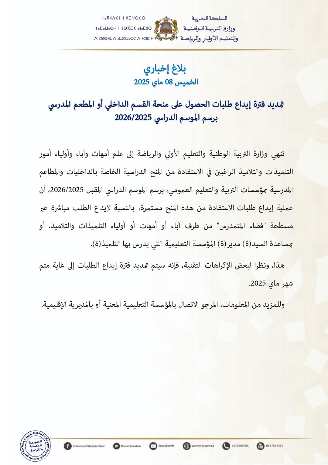 أعلنت وزارة التربية الوطنية والتعليم الأولى والرياضة في بلاغ إخباري لها اليوم الخميس 08 ماي 2025، عن تمديد فترة إيداع طلبات الحصول على منحة القسم الداخلي أو المطعم المدرسي برسم الموسم الدراسي 2026/2025.