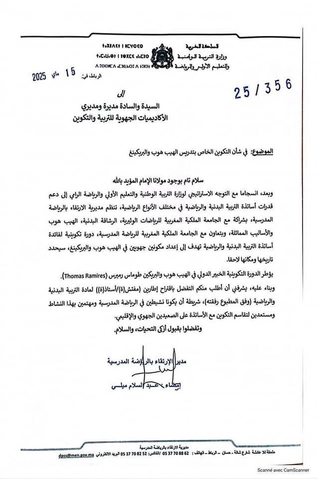 أثارت مراسلة جديدة صادرة عن وزارة التربية الوطنية والتعليم الأولي والرياضة، بتاريخ 15 ماي 2025، جدلاً واسعًا وسخرية كبيرة، بعد أن دعت إلى تنظيم دورة تكوينية لتدريس رياضتي "الهيب هوب" و"البريكينغ" لفائدة أساتذة مادة التربية البدنية.