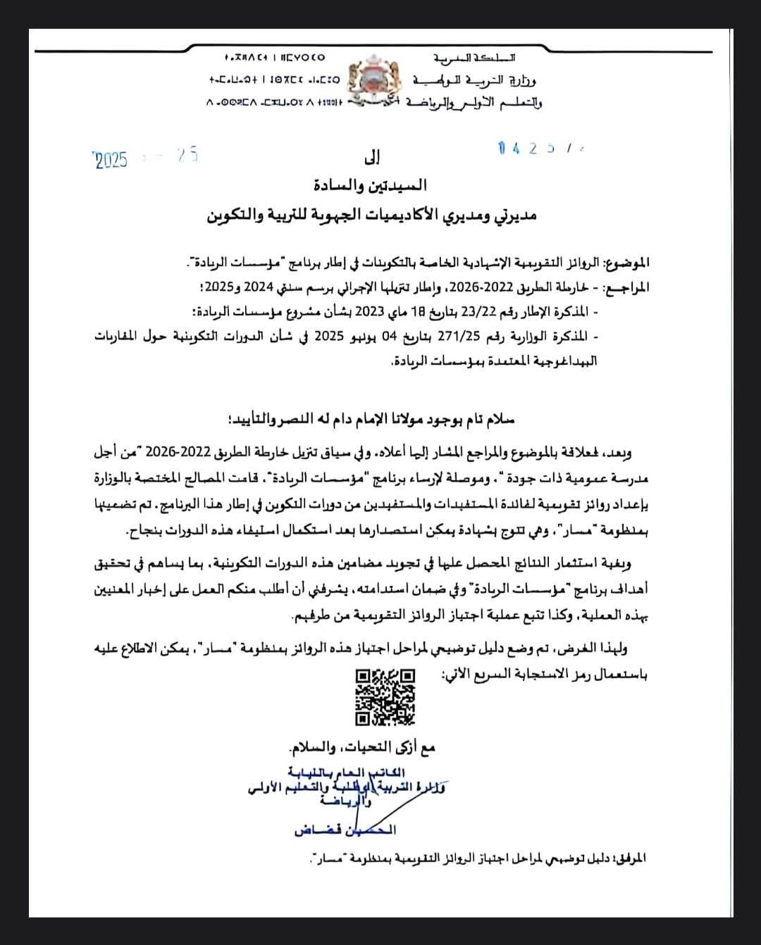 وتفعيلا للمذكرة الإطار 23/22 الصادرة بتاريخ 18 ماي 2023، والمذكرة الوزارية الأخيرة رقم 271/25 المؤرخة في 4 يونيو الجاري، أعلنت الوزارة عن جاهزية الروائز التقويمية الإشهادية الخاصة بالتكوينات المرتبطة بهذا البرنامج الطموح، حيث تم إدراجها داخل منظومة "مسار"، على أن يتوج اجتيازها الناجح بشهادة رسمية، تتيح للمستفيدين توثيق مكتسباتهم التكوينية ضمن مصوغات مهنية معترف بها.