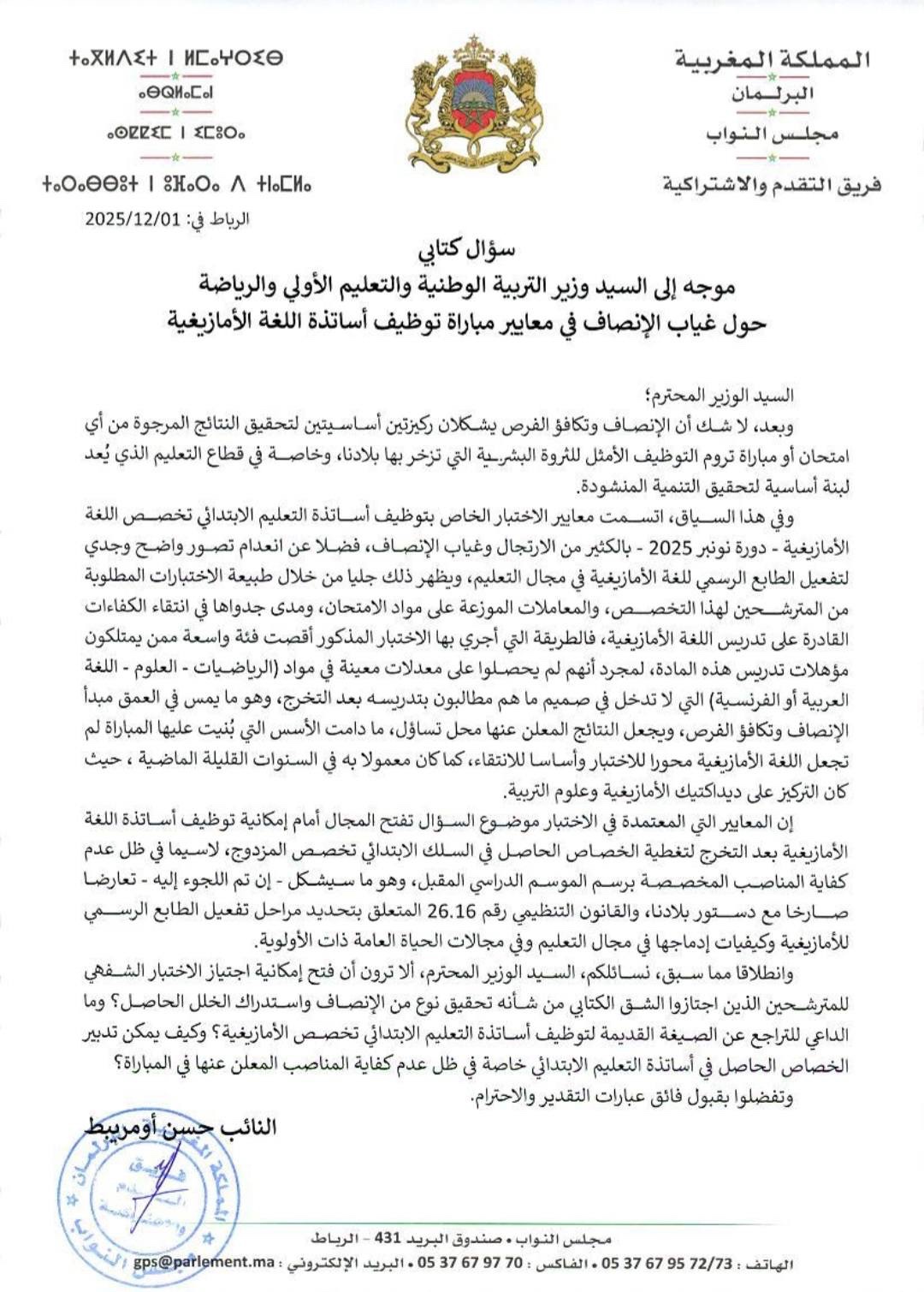 وجه النائب البرلماني عن حزب التقدم والاشتراكية، حسن أومريبط، انتقادات حادة لوزارة التربية الوطنية والتعليم الأولي والرياضة عبر سؤال كتابي، مُستنكرا بشدة ما وصفه بـ"غياب الإنصاف وتكافؤ الفرص" في معايير مباراة توظيف أساتذة التعليم الابتدائي تخصص اللغة الأمازيغية برسم دورة نونبر 2025.
