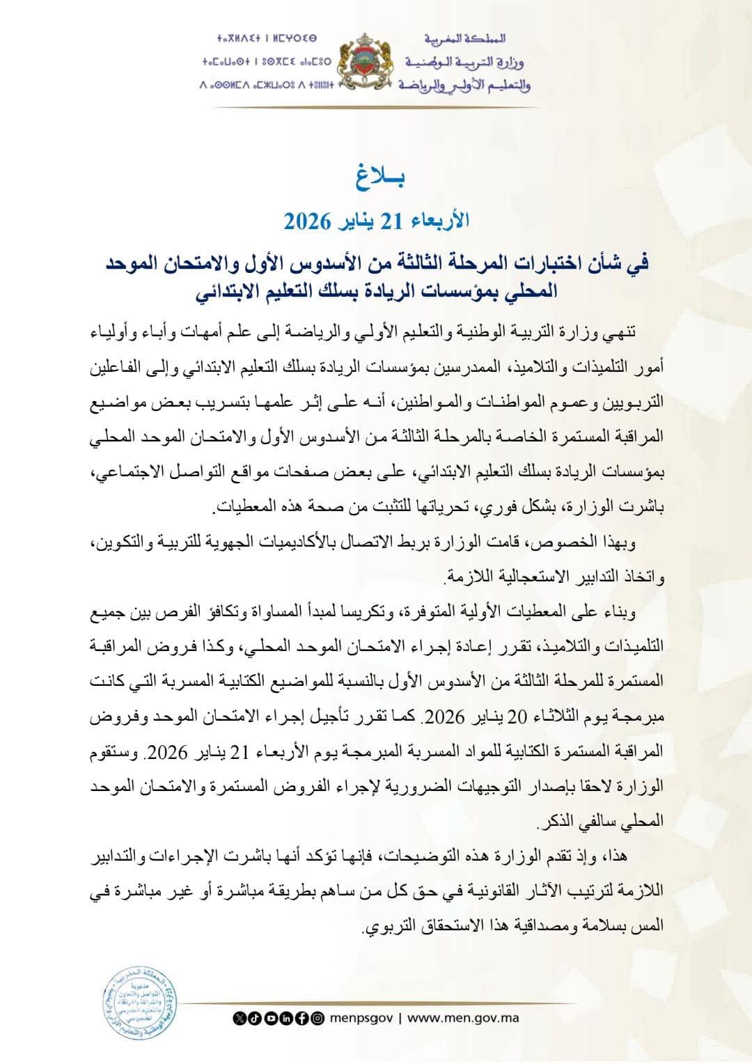 كما قررت الوزارة تأجيل إجراء الامتحان الموحد وفروض المراقبة المستمرة الكتابية للمواد المسربة، التي كانت مبرمجة يوم الأربعاء 21 يناير 2026، على أن يتم لاحقا إصدار التوجيهات الضرورية المتعلقة بإعادة تنظيم هذه الاستحقاقات في ظروف تضمن النزاهة والإنصاف.