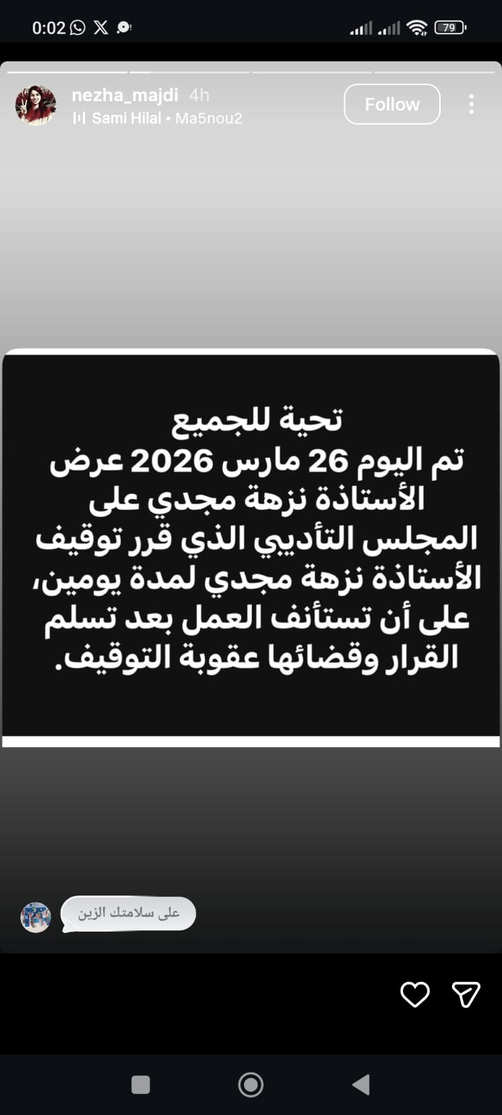 وفي الـ"استوري" الثاني، نشرت المعنية صورة لتدوينة جاء فيها: "تحية للجميع تم اليوم 26 مارس 2026 عرض الأستاذة نزهة مجدي على المجلس التأديبي الذي قرر توقيفها لمدة يومين على أن تستأنف العمل بعد تسلم القرار وقضائها عقوبة التوقيف".
