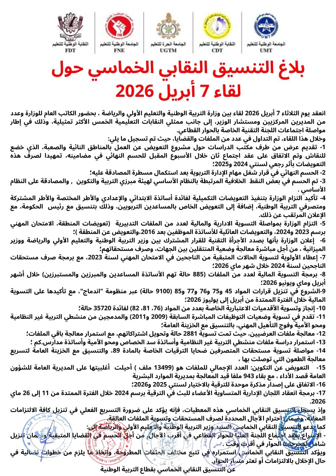 وفي ختام الاجتماع، تم الاتفاق على إصدار مذكرة موحدة للترقية بالاختيار لسنتي 2025 و2026، مع برمجة انعقاد اللجان الإدارية المتساوية الأعضاء للبث في الترقية برسم سنة 2024 خلال الفترة الممتدة من 11 إلى 26 ماي 2026؛ وفي المقابل، شدد التنسيق النقابي الخماسي على ضرورة التسريع الفعلي في تنزيل كافة الالتزامات واحترام الآجال المحددة لصرف المستحقات وتسوية الملفات العالقة، داعيا وزير التربية الوطنية والتعليم الأولي والرياضة إلى التعجيل بعقد اجتماع اللجنة العليا للحوار القطاعي للحسم في القضايا المتبقية وضمان تنزيل شامل لمخرجات الحوار، مع التأكيد على مواصلة تتبع مختلف الملفات واتخاذ ما يلزم من خطوات نضالية في حال الإخلال بالالتزامات أو تعثر المسار.