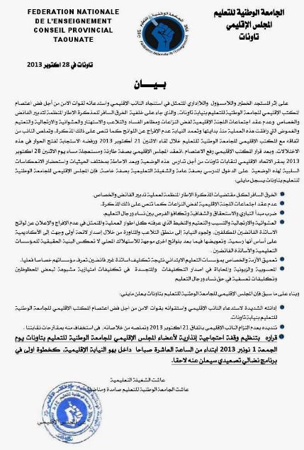 كما تعرض البيان للمحسوبية والزبونية والمحاباة في إصدار تكليفات إمتيازية لبعض المحظوظين، وأخرى تعسفية لعموم نساء ورجال التعليم. ولم يفت المجلس توجيه سهام نقده لإستدعاء النائب لقوات عمومية بغرض فض إعتصام مكتب الجامعة الوطنية للتعليم بالنيابة، وأيضا لعدم إلتزامه بما تم الإتفاق عليه في وقت سابق من هذا الشهر، وأعلن تنظيمه وقفة إحتجاجية إنذارية لأعضاء المجلس فاتح نونبر المقبل ببهو النيابة، في إطار برنامج نضالي تصعيدي.
