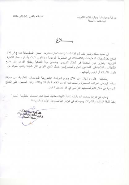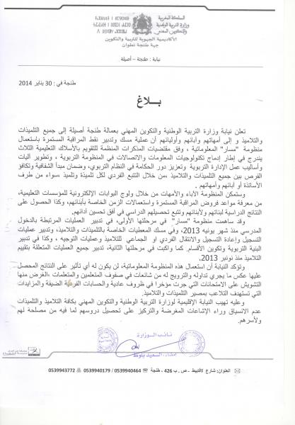 تعلن نيابة وزارة التربية الوطنية والتكوين المهني بعمالة طنجة أصيلة إلى جميع التلميذات والتلاميذ و إلى أمهاتهم وآبائهم وأوليائهم أن عملية مسك وتدبير نقط المراقبة المستمرة باستعمال منظومة "مسار" المعلوماتية ، وفق مقتضيات المذكرات المنظمة للتقويم بالأسلاك التعليمية الثلاث يندرج في إطار إدماج تكنولوجيات المعلومات والاتصالات في المنظومة التربوية ، وتطوير آليات وأساليب عمل الإدارة التربوية وتعزيز دور الحكامة في النظام التربوي، وضمان مبدأ الشفافية وتكافؤ الفرص بين جميع التلميذات والتلاميذ ،من خلال التتبع الفردي لكل تلميذة وتلميذ ،سواء من طرف الأساتذة أو آبائهم وأمهاتهم.