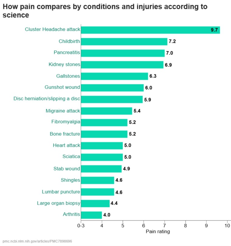 وُجد أن حصوات الكلى والمرارة من بين أكثر الآلام الحارقة التي تم تسجيلها، بينما أعطى المصابون بجروح الطلقات النارية تقييمًا للألم بلغ 6 نقاط في المتوسط، مع اختلاف شدته حسب موضع الإصابة. كما ظهر الانزلاق الغضروفي عند 5.9 نقاط، متجاوزًا الصداع النصفي، الذي سجل 5.4، والنوبات القلبية التي لم تتجاوز 5 نقاط.