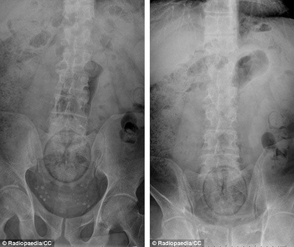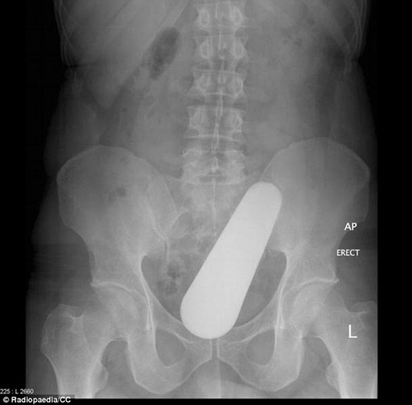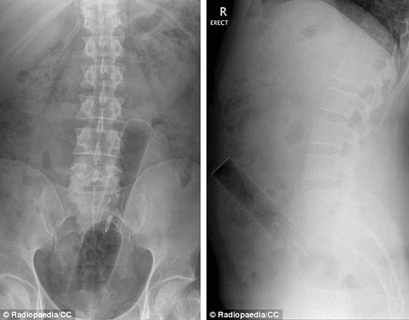 صورة لأشعة "إكس راي" توضح دخول أنبوب لعلبة فيتامينات.