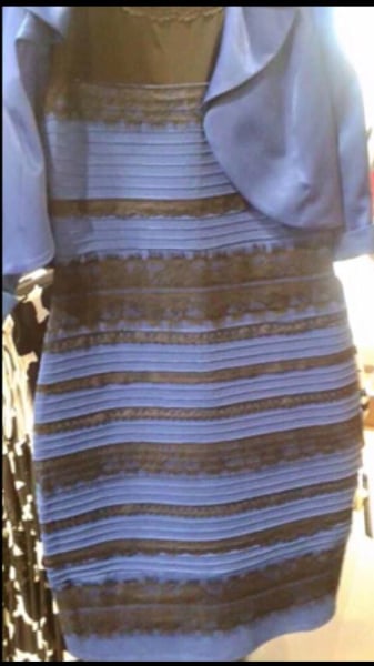 وذهبت تفسيرات العلماء في البداية إلى أن رؤية الفستان باللونين الأبيض والذهبي تعود إلى أن الضوء يدخل إلى العين من خلال العدسات، ويختلف طول موجات الضوء التي تقع على عدسة العين باختلاف الألوان نفسها، بعدها يضرب الضوء الشبكية في الجزء الخلفي من العين، فتثير أصباغ الألوان الوصلات العصبية الممتدة إلى القشرة الدماغية التي تعالج هذه الإشارات وتحولها إلى صور وألوان.