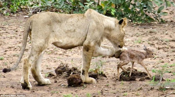 ويقول غرايم ميتشلي (45 عاماً) وهو نائب مدير مدرسة كان في رحلة مع زوجته في الحديقة، إنه شاهد الأسد يحمل شيئاً ما في فمه، واعتقد في البداية إنه أحد صغاره، لكنه فوجىء عندما تبين أن الصغير الذي يحمله، هو غزال افترق عن والدته.