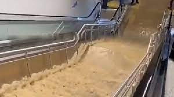 وتظهر المشاهد تدفق كميات كبيرة من المياه إلى أسفل إحدى محطات المترو، حيث غطت المياه السلم وتدفقت باتجاه الأسفل.