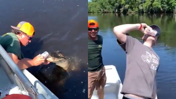 وفي الفيديو، يضع الرجل يده في الماء لجذب انتباه التمساح الصغير الحجم، الذي يستخدم أسنانه الحادة لثقب علبة البيرة، ثم يشرع الرجل بعدها في الشرب من العلبة.